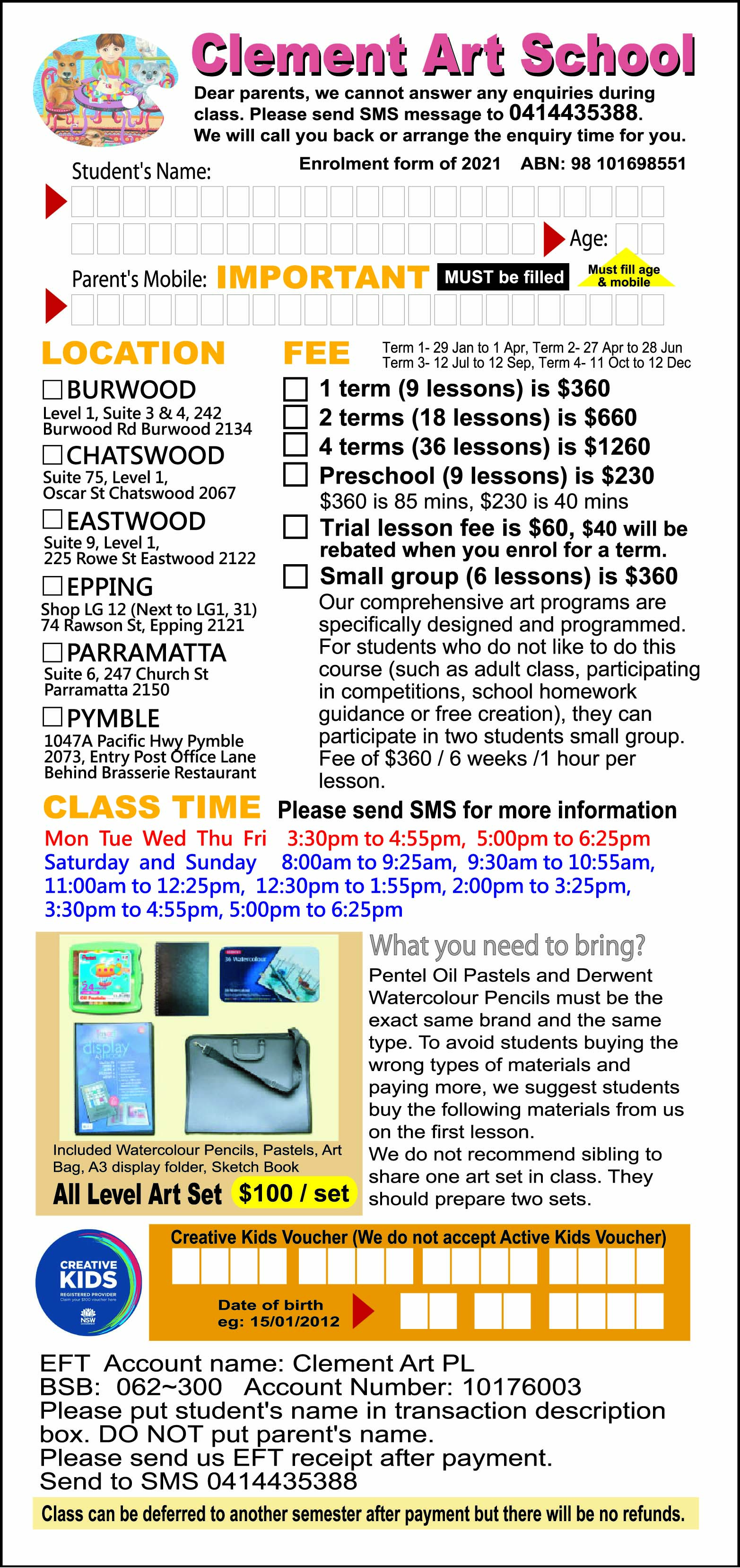 Art Class enrolment form 2021 print